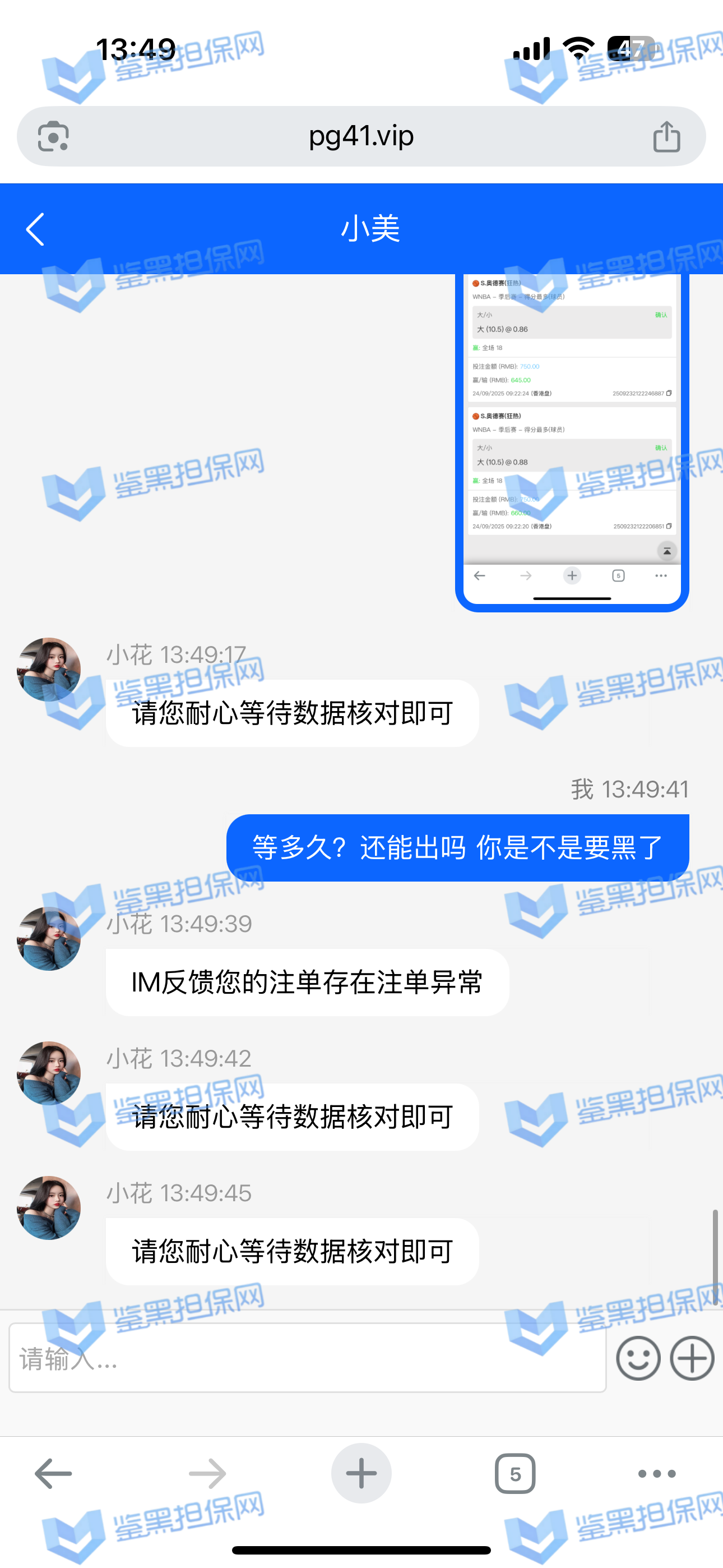 2、鉴黑担保网维权专员联系该平台相关负责人核实情况,对方表示IM注单涉嫌存在异常,IM体育平台抽查审核,需要等待审核结果,若审核无异常会尽快出款,维权专员沟通协商要求催促审核进度,要求重视用户游戏体验以及平台信誉等问题,对方说明后表示会尽快完成审核,请耐心等待。